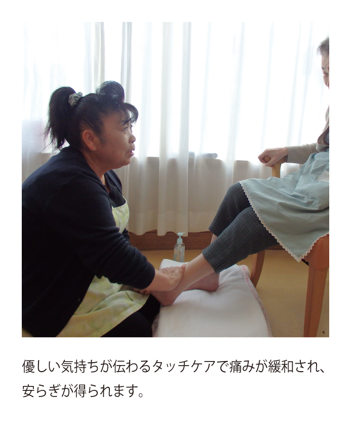 手術などの治療による回復が望めなくなった方に対する看取りケアもおこなっております。ご家族様、ご本人様の意思を尊重しながら、往診可能な医療機関と連携し、指示を仰ぎ苦痛を和らげる事に重点をおいた対応をおこないます。