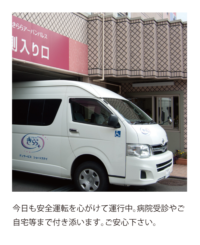送迎・受診、定期受診など、ご家族が対応できない場合、施設職員が送迎・通院介助を365日無料で対応します。