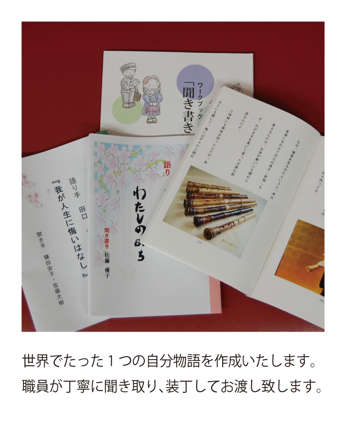利用者様の人生を聞き取り、語られたままの言葉を冊子にしたものです。全てのご利用者様に無料でお作りしています。思い出がたくさん詰まった「世界で一つだけの冊子」を、是非、きららでお作り下さい。