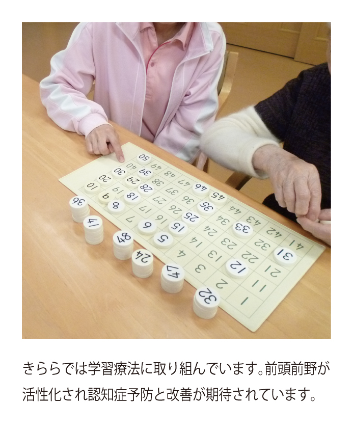 きららでは各事業所に上記のくもん学習療法の正しい理論と手順をマスターした「学習療法実践士」資格を取得した職員を育成し、より質の高い認知症ケアの実践とご利用者様の介護の力を高めています。