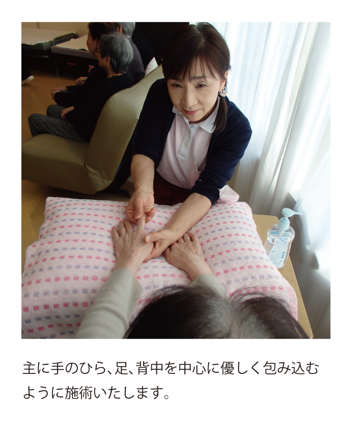 スウェーデン発症のタクティールケアは、相手の背中や手足を「押す」のではなく、柔らかく包み込むように触れることで、不安やストレスを和らげる緩和ケアです。認知症による病状の緩和はもちろん、親・子供などご家族にも癒しを与えることができます。きららホールディングスはタクティールケアの秋田県唯一の地域中核教育センターであり、タクティールケアを取り入れながらの介護に努めます。