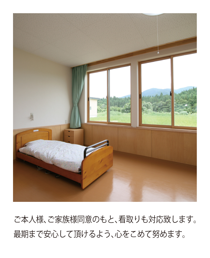 体調が悪化した場合も負担の大きい救急搬送ではなく、住み慣れた環境・施設で安らかに清らかに最期を迎える事を目的としております。