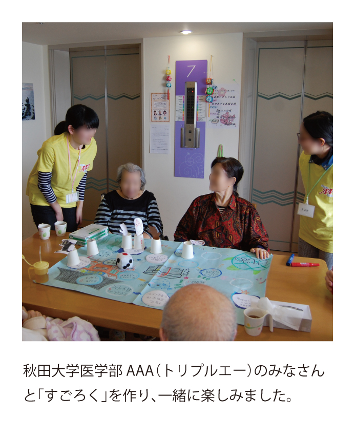 秋田大学医学部サークルMedicAが組織する、医療系のケアボランティアで、介護施設『きららアーバンパレス』で定期的にボランティアを行うグループです。
