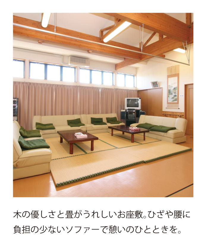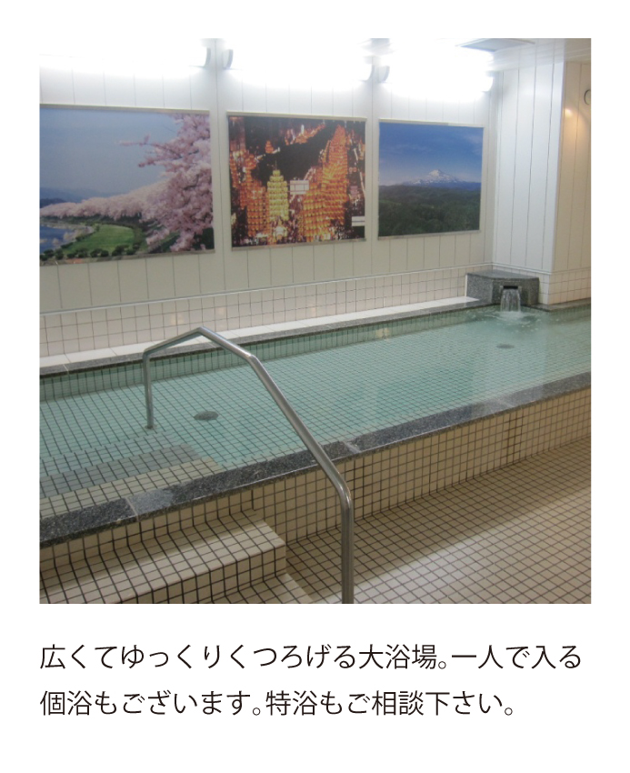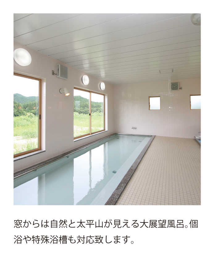 太平山をはじめとする豊かな自然を望める展望風呂「天然鉱石温泉・きららの湯」は健康と疲労回復により効果があります。広々とした団らんスペース、畳のくつろぎコーナー等、ゆっくりとした時間をお過ごしいただけます。理学療法士が行う充実したリハビリメニューやくもんの学習療法等を取り入れています。