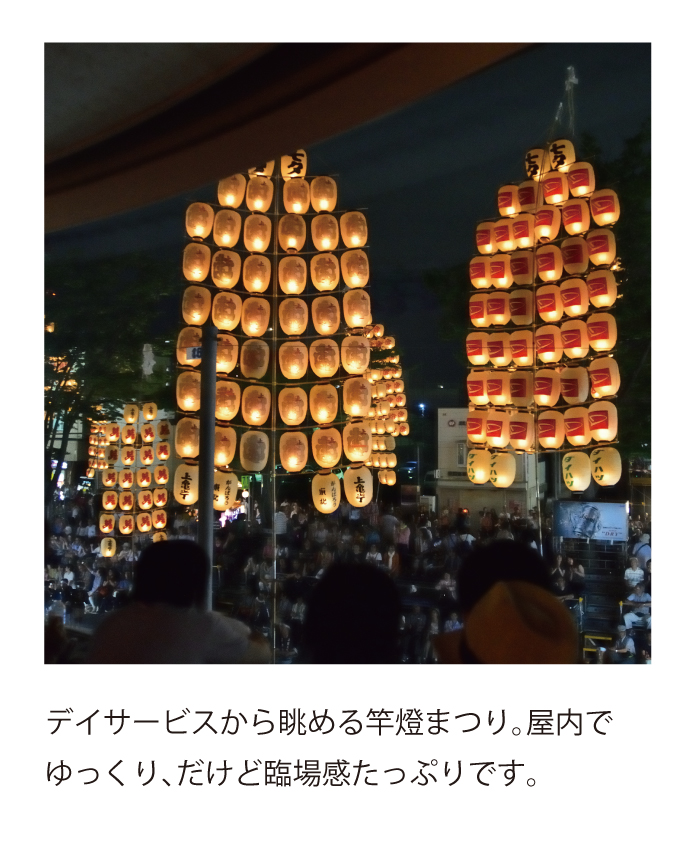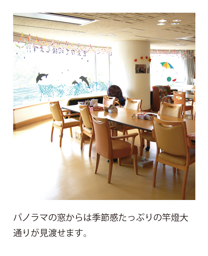 秋田市のメインストリートに立地したきららアーバンパレス3階にあるデイサービスです。開放的な大きな窓からは、鳥海山・大森山・秋田市内・竿燈まつりが一望できます。季節に合わせた四季折々の行事や、地域の子供たちやきらら保育園の園児との世代間交流など、明るく笑顔あふれる空間をご提供しています。