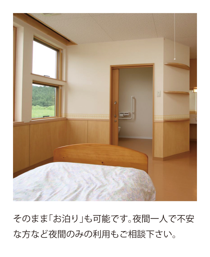 昼間のデイサービスを利用した後に、そのまま「きらら」にお泊りすることができます。デイサービスの利用ではない日に、宿泊サービスを利用したい場合も夜間のみの利用が可能です。ご家族様に急用ができて外出するとき等、夜間お一人で不安な方におすすめです。ショートステイの予約や施設入所の必要がなく、ご本人様やご家族様に使いやすいサービスです。