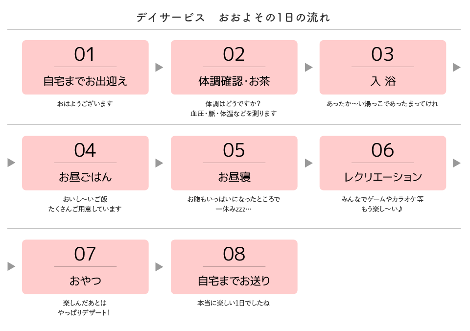 上記は基本の流れですので、お客様の体調・ご希望を取り入れながらお過ごしいただいております。